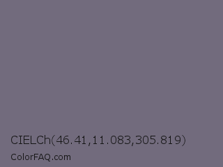 CIELCh 46.41,11.083,305.819 Color is a normal violet color and the nearest color is Fedora #796a78. Hex code #726b7d and RGB value is rgb(114,107,125). In RGB color space, this color is composed of 45% red, 42% green, 49% blue, In CMYK color space, this color is composed of 9% cyan, 14% magenta, 0% yellow , 51% black , In HSL color space, this color has a hue angle of 263° , 8% saturation and 45% lightness.