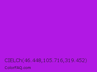 CIELCh 46.448,105.716,319.452 Color is a normal purple color and the nearest color is Vivid Mulberry #b80ce3. Hex code #b118e4 and RGB value is rgb(177,24,228). In RGB color space, this color is composed of 69% red, 9% green, 89% blue, In CMYK color space, this color is composed of 22% cyan, 89% magenta, 0% yellow , 11% black , In HSL color space, this color has a hue angle of 285° , 81% saturation and 49% lightness.