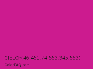 CIELCh 46.451,74.553,345.553 Color is a normal magenta color and the nearest color is Red Violet #c71585. Hex code #cc1b8f and RGB value is rgb(204,27,143). In RGB color space, this color is composed of 80% red, 11% green, 56% blue, In CMYK color space, this color is composed of 0% cyan, 87% magenta, 30% yellow , 20% black , In HSL color space, this color has a hue angle of 321° , 77% saturation and 45% lightness.