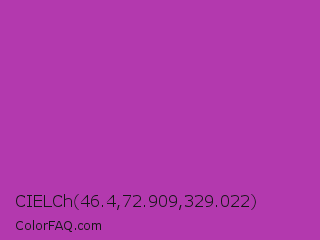 CIELCh 46.4,72.909,329.022 Color is a normal magenta color and the nearest color is Byzantine #bd33a4. Hex code #b339ae and RGB value is rgb(179,57,174). In RGB color space, this color is composed of 70% red, 22% green, 68% blue, In CMYK color space, this color is composed of 0% cyan, 68% magenta, 3% yellow , 30% black , In HSL color space, this color has a hue angle of 302° , 52% saturation and 46% lightness.
