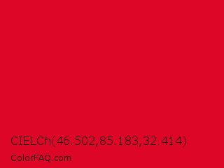 CIELCh 46.502,85.183,32.414 Color is a normal red color and the nearest color is Medium Candy Apple Red #e2062c. Hex code #dd0626 and RGB value is rgb(221,6,38). In RGB color space, this color is composed of 87% red, 2% green, 15% blue, In CMYK color space, this color is composed of 0% cyan, 97% magenta, 83% yellow , 13% black , In HSL color space, this color has a hue angle of 351° , 95% saturation and 45% lightness.