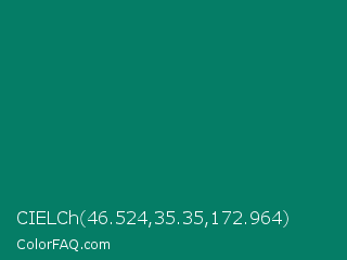 CIELCh 46.524,35.35,172.964 Color is a dark cyan color and the nearest color is Generic Viridian #007f66. Hex code #057d66 and RGB value is rgb(5,125,102). In RGB color space, this color is composed of 2% red, 49% green, 40% blue, In CMYK color space, this color is composed of 96% cyan, 0% magenta, 18% yellow , 51% black , In HSL color space, this color has a hue angle of 169° , 92% saturation and 25% lightness.