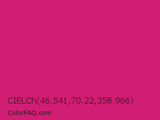 CIELCh 46.541,70.22,358.966 Color is a normal rose color and the nearest color is Magenta Dye #ca1f7b. Hex code #d11d73 and RGB value is rgb(209,29,115). In RGB color space, this color is composed of 82% red, 11% green, 45% blue, In CMYK color space, this color is composed of 0% cyan, 86% magenta, 45% yellow , 18% black , In HSL color space, this color has a hue angle of 331° , 76% saturation and 47% lightness.