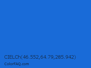 CIELCh 46.552,64.79,285.942 Color is a normal blue color and the nearest color is Bright Navy Blue #1974d2. Hex code #196bd8 and RGB value is rgb(25,107,216). In RGB color space, this color is composed of 10% red, 42% green, 85% blue, In CMYK color space, this color is composed of 88% cyan, 50% magenta, 0% yellow , 15% black , In HSL color space, this color has a hue angle of 214° , 79% saturation and 47% lightness.
