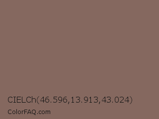 CIELCh 46.596,13.913,43.024 Color is a normal red color and the nearest color is Sand Dune #826f65. Hex code #85685f and RGB value is rgb(133,104,95). In RGB color space, this color is composed of 52% red, 41% green, 37% blue, In CMYK color space, this color is composed of 0% cyan, 22% magenta, 29% yellow , 48% black , In HSL color space, this color has a hue angle of 14° , 17% saturation and 45% lightness.