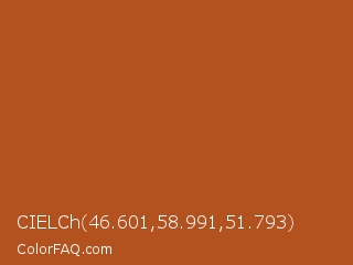 CIELCh 46.601,58.991,51.793 Color is a normal orange color and the nearest color is Fiery Orange #b35213. Hex code #b3521f and RGB value is rgb(179,82,31). In RGB color space, this color is composed of 70% red, 32% green, 12% blue, In CMYK color space, this color is composed of 0% cyan, 54% magenta, 83% yellow , 30% black , In HSL color space, this color has a hue angle of 21° , 70% saturation and 41% lightness.