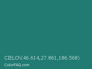 CIELCh 46.614,27.861,186.568 Color is a normal cyan color and the nearest color is Elm #1c7c7d. Hex code #217b73 and RGB value is rgb(33,123,115). In RGB color space, this color is composed of 13% red, 48% green, 45% blue, In CMYK color space, this color is composed of 73% cyan, 0% magenta, 7% yellow , 52% black , In HSL color space, this color has a hue angle of 175° , 58% saturation and 31% lightness.