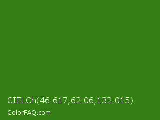 CIELCh 46.617,62.06,132.015 Color is a dark green color and the nearest color is Bilbao #327c14. Hex code #357e14 and RGB value is rgb(53,126,20). In RGB color space, this color is composed of 21% red, 49% green, 8% blue, In CMYK color space, this color is composed of 58% cyan, 0% magenta, 84% yellow , 51% black , In HSL color space, this color has a hue angle of 101° , 73% saturation and 29% lightness.