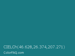 CIELCh 46.628,26.374,207.271 Color is a dark cyan color and the nearest color is Elm #1c7c7d. Hex code #197a82 and RGB value is rgb(25,122,130). In RGB color space, this color is composed of 10% red, 48% green, 51% blue, In CMYK color space, this color is composed of 81% cyan, 6% magenta, 0% yellow , 49% black , In HSL color space, this color has a hue angle of 185° , 68% saturation and 30% lightness.