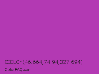 CIELCh 46.664,74.94,327.694 Color is a normal magenta color and the nearest color is Byzantine #bd33a4. Hex code #b339b3 and RGB value is rgb(179,57,179). In RGB color space, this color is composed of 70% red, 22% green, 70% blue, In CMYK color space, this color is composed of 0% cyan, 68% magenta, 0% yellow , 30% black , In HSL color space, this color has a hue angle of 300° , 52% saturation and 46% lightness.