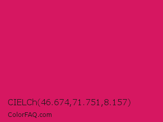 CIELCh 46.674,71.751,8.157 Color is a normal rose color and the nearest color is Dogwood Rose #d71868. Hex code #d61761 and RGB value is rgb(214,23,97). In RGB color space, this color is composed of 84% red, 9% green, 38% blue, In CMYK color space, this color is composed of 0% cyan, 89% magenta, 55% yellow , 16% black , In HSL color space, this color has a hue angle of 337° , 81% saturation and 46% lightness.