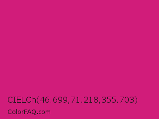 CIELCh 46.699,71.218,355.703 Color is a normal rose color and the nearest color is Magenta Dye #ca1f7b. Hex code #d11c7a and RGB value is rgb(209,28,122). In RGB color space, this color is composed of 82% red, 11% green, 48% blue, In CMYK color space, this color is composed of 0% cyan, 87% magenta, 42% yellow , 18% black , In HSL color space, this color has a hue angle of 329° , 76% saturation and 46% lightness.