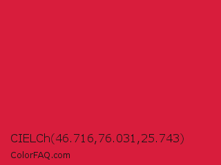CIELCh 46.716,76.031,25.743 Color is a normal red color and the nearest color is Crimson #dc143c. Hex code #d81d3c and RGB value is rgb(216,29,60). In RGB color space, this color is composed of 85% red, 11% green, 24% blue, In CMYK color space, this color is composed of 0% cyan, 87% magenta, 72% yellow , 15% black , In HSL color space, this color has a hue angle of 350° , 76% saturation and 48% lightness.