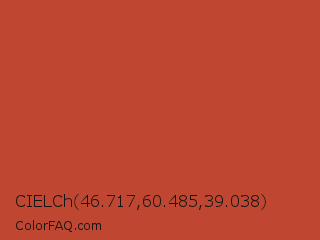 CIELCh 46.717,60.485,39.038 Color is a normal red color and the nearest color is Mojo #c04737. Hex code #bf4731 and RGB value is rgb(191,71,49). In RGB color space, this color is composed of 75% red, 28% green, 19% blue, In CMYK color space, this color is composed of 0% cyan, 63% magenta, 74% yellow , 25% black , In HSL color space, this color has a hue angle of 9° , 59% saturation and 47% lightness.