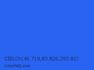 CIELCh 46.719,83.826,293.82 Color is a normal blue color and the nearest color is Blue Crayola #1f75fe. Hex code #2963f2 and RGB value is rgb(41,99,242). In RGB color space, this color is composed of 16% red, 39% green, 95% blue, In CMYK color space, this color is composed of 83% cyan, 59% magenta, 0% yellow , 5% black , In HSL color space, this color has a hue angle of 223° , 89% saturation and 55% lightness.