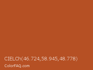 CIELCh 46.724,58.945,48.778 Color is a normal orange color and the nearest color is Fiery Orange #b35213. Hex code #b65024 and RGB value is rgb(182,80,36). In RGB color space, this color is composed of 71% red, 31% green, 14% blue, In CMYK color space, this color is composed of 0% cyan, 56% magenta, 80% yellow , 29% black , In HSL color space, this color has a hue angle of 18° , 67% saturation and 43% lightness.