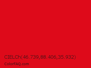 CIELCh 46.739,88.406,35.932 Color is a normal red color and the nearest color is Cadmium Red #e30022. Hex code #de0a1a and RGB value is rgb(222,10,26). In RGB color space, this color is composed of 87% red, 4% green, 10% blue, In CMYK color space, this color is composed of 0% cyan, 95% magenta, 88% yellow , 13% black , In HSL color space, this color has a hue angle of 355° , 91% saturation and 45% lightness.