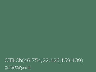 CIELCh 46.754,22.126,159.139 Color is a normal green color and the nearest color is Como #517c66. Hex code #4c7861 and RGB value is rgb(76,120,97). In RGB color space, this color is composed of 30% red, 47% green, 38% blue, In CMYK color space, this color is composed of 37% cyan, 0% magenta, 19% yellow , 53% black , In HSL color space, this color has a hue angle of 149° , 22% saturation and 38% lightness.