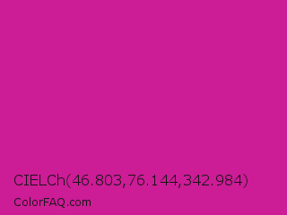 CIELCh 46.803,76.144,342.984 Color is a normal magenta color and the nearest color is Royal Fuchsia #ca2c92. Hex code #cc1c96 and RGB value is rgb(204,28,150). In RGB color space, this color is composed of 80% red, 11% green, 59% blue, In CMYK color space, this color is composed of 0% cyan, 86% magenta, 26% yellow , 20% black , In HSL color space, this color has a hue angle of 318° , 76% saturation and 45% lightness.
