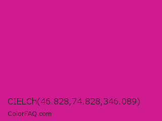 CIELCh 46.828,74.828,346.089 Color is a normal magenta color and the nearest color is Red Violet #c71585. Hex code #ce1b8f and RGB value is rgb(206,27,143). In RGB color space, this color is composed of 81% red, 11% green, 56% blue, In CMYK color space, this color is composed of 0% cyan, 87% magenta, 31% yellow , 19% black , In HSL color space, this color has a hue angle of 321° , 77% saturation and 46% lightness.