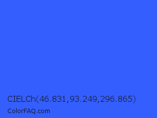 CIELCh 46.831,93.249,296.865 Color is a normal blue color and the nearest color is Ultramarine Blue #4166f5. Hex code #345efe and RGB value is rgb(52,94,254). In RGB color space, this color is composed of 20% red, 37% green, 100% blue, In CMYK color space, this color is composed of 80% cyan, 63% magenta, 0% yellow , 0% black , In HSL color space, this color has a hue angle of 228° , 99% saturation and 60% lightness.