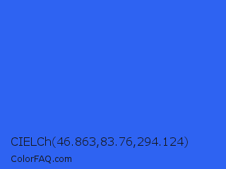 CIELCh 46.863,83.76,294.124 Color is a normal blue color and the nearest color is Ultramarine Blue #4166f5. Hex code #2e63f2 and RGB value is rgb(46,99,242). In RGB color space, this color is composed of 18% red, 39% green, 95% blue, In CMYK color space, this color is composed of 81% cyan, 59% magenta, 0% yellow , 5% black , In HSL color space, this color has a hue angle of 224° , 88% saturation and 56% lightness.