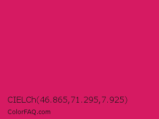 CIELCh 46.865,71.295,7.925 Color is a normal rose color and the nearest color is Dogwood Rose #d71868. Hex code #d61a62 and RGB value is rgb(214,26,98). In RGB color space, this color is composed of 84% red, 10% green, 38% blue, In CMYK color space, this color is composed of 0% cyan, 88% magenta, 54% yellow , 16% black , In HSL color space, this color has a hue angle of 337° , 78% saturation and 47% lightness.