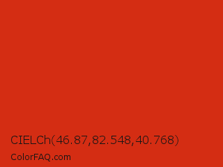 CIELCh 46.87,82.548,40.768 Color is a normal red color and the nearest color is Vermilion #d9381e. Hex code #d42d13 and RGB value is rgb(212,45,19). In RGB color space, this color is composed of 83% red, 18% green, 7% blue, In CMYK color space, this color is composed of 0% cyan, 79% magenta, 91% yellow , 17% black , In HSL color space, this color has a hue angle of 8° , 84% saturation and 45% lightness.