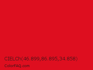 CIELCh 46.899,86.895,34.858 Color is a normal red color and the nearest color is Cadmium Red #e30022. Hex code #de0e1f and RGB value is rgb(222,14,31). In RGB color space, this color is composed of 87% red, 5% green, 12% blue, In CMYK color space, this color is composed of 0% cyan, 94% magenta, 86% yellow , 13% black , In HSL color space, this color has a hue angle of 355° , 88% saturation and 46% lightness.