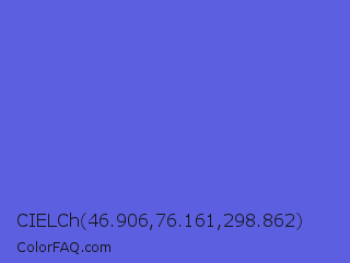 CIELCh 46.906,76.161,298.862 Color is a light blue color and the nearest color is Majorelle Blue #6050dc. Hex code #5d5fe1 and RGB value is rgb(93,95,225). In RGB color space, this color is composed of 36% red, 37% green, 88% blue, In CMYK color space, this color is composed of 59% cyan, 58% magenta, 0% yellow , 12% black , In HSL color space, this color has a hue angle of 239° , 69% saturation and 62% lightness.
