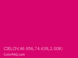 CIELCh 46.956,74.639,2.008 Color is a normal rose color and the nearest color is Red Purple #e40078. Hex code #d9056e and RGB value is rgb(217,5,110). In RGB color space, this color is composed of 85% red, 2% green, 43% blue, In CMYK color space, this color is composed of 0% cyan, 98% magenta, 49% yellow , 15% black , In HSL color space, this color has a hue angle of 330° , 95% saturation and 44% lightness.