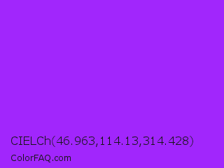 CIELCh 46.963,114.13,314.428 Color is a normal purple color and the nearest color is Veronica #a020f0. Hex code #a126fc and RGB value is rgb(161,38,252). In RGB color space, this color is composed of 63% red, 15% green, 99% blue, In CMYK color space, this color is composed of 36% cyan, 85% magenta, 0% yellow , 1% black , In HSL color space, this color has a hue angle of 274° , 97% saturation and 57% lightness.