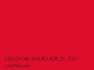 CIELCh 46.964,83.828,31.231 Color is a normal red color and the nearest color is Medium Candy Apple Red #e2062c. Hex code #de0d2b and RGB value is rgb(222,13,43). In RGB color space, this color is composed of 87% red, 5% green, 17% blue, In CMYK color space, this color is composed of 0% cyan, 94% magenta, 81% yellow , 13% black , In HSL color space, this color has a hue angle of 351° , 89% saturation and 46% lightness.