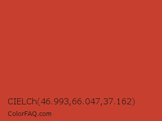 CIELCh 46.993,66.047,37.162 Color is a normal red color and the nearest color is International Orange Golden Gate Bridge #c0362c. Hex code #c7402f and RGB value is rgb(199,64,47). In RGB color space, this color is composed of 78% red, 25% green, 18% blue, In CMYK color space, this color is composed of 0% cyan, 68% magenta, 76% yellow , 22% black , In HSL color space, this color has a hue angle of 7° , 62% saturation and 48% lightness.