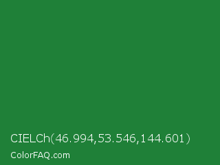 CIELCh 46.994,53.546,144.601 Color is a normal green color and the nearest color is Dark Spring Green #177245. Hex code #1f8038 and RGB value is rgb(31,128,56). In RGB color space, this color is composed of 12% red, 50% green, 22% blue, In CMYK color space, this color is composed of 76% cyan, 0% magenta, 56% yellow , 50% black , In HSL color space, this color has a hue angle of 135° , 61% saturation and 31% lightness.
