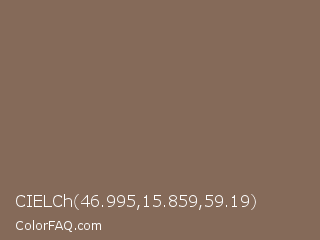 CIELCh 46.995,15.859,59.19 Color is a normal orange color and the nearest color is Pastel Brown #836953. Hex code #856a59 and RGB value is rgb(133,106,89). In RGB color space, this color is composed of 52% red, 42% green, 35% blue, In CMYK color space, this color is composed of 0% cyan, 20% magenta, 33% yellow , 48% black , In HSL color space, this color has a hue angle of 23° , 20% saturation and 44% lightness.