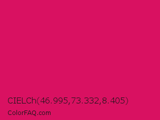 CIELCh 46.995,73.332,8.405 Color is a normal rose color and the nearest color is Ruby #e0115f. Hex code #d91161 and RGB value is rgb(217,17,97). In RGB color space, this color is composed of 85% red, 7% green, 38% blue, In CMYK color space, this color is composed of 0% cyan, 92% magenta, 55% yellow , 15% black , In HSL color space, this color has a hue angle of 336° , 85% saturation and 46% lightness.