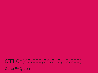 CIELCh 47.033,74.717,12.203 Color is a normal rose color and the nearest color is Debian Red #d70a53. Hex code #db0c59 and RGB value is rgb(219,12,89). In RGB color space, this color is composed of 86% red, 5% green, 35% blue, In CMYK color space, this color is composed of 0% cyan, 95% magenta, 59% yellow , 14% black , In HSL color space, this color has a hue angle of 338° , 90% saturation and 45% lightness.