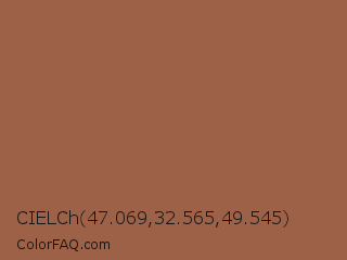 CIELCh 47.069,32.565,49.545 Color is a normal orange color and the nearest color is Cape Palliser #a26645. Hex code #9c6147 and RGB value is rgb(156,97,71). In RGB color space, this color is composed of 61% red, 38% green, 28% blue, In CMYK color space, this color is composed of 0% cyan, 38% magenta, 54% yellow , 39% black , In HSL color space, this color has a hue angle of 18° , 37% saturation and 45% lightness.