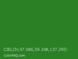 CIELCh 47.086,59.348,137.295 Color is a normal green color and the nearest color is Forest Green #228b22. Hex code #2b8025 and RGB value is rgb(43,128,37). In RGB color space, this color is composed of 17% red, 50% green, 15% blue, In CMYK color space, this color is composed of 66% cyan, 0% magenta, 71% yellow , 50% black , In HSL color space, this color has a hue angle of 116° , 55% saturation and 32% lightness.