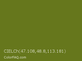 CIELCh 47.108,48.8,113.181 Color is a dark lime color and the nearest color is Fern Frond #657220. Hex code #66771c and RGB value is rgb(102,119,28). In RGB color space, this color is composed of 40% red, 47% green, 11% blue, In CMYK color space, this color is composed of 14% cyan, 0% magenta, 76% yellow , 53% black , In HSL color space, this color has a hue angle of 71° , 62% saturation and 29% lightness.