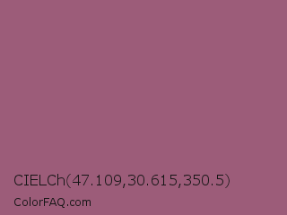 CIELCh 47.109,30.615,350.5 Color is a normal rose color and the nearest color is Rose Dust #9e5e6f. Hex code #9c5c79 and RGB value is rgb(156,92,121). In RGB color space, this color is composed of 61% red, 36% green, 47% blue, In CMYK color space, this color is composed of 0% cyan, 41% magenta, 22% yellow , 39% black , In HSL color space, this color has a hue angle of 333° , 26% saturation and 49% lightness.