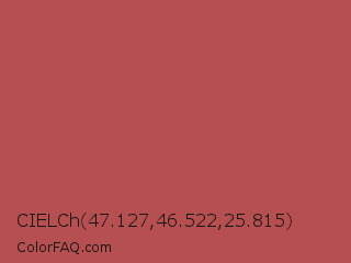 CIELCh 47.127,46.522,25.815 Color is a normal red color and the nearest color is Deep Chestnut #b94e48. Hex code #b64f50 and RGB value is rgb(182,79,80). In RGB color space, this color is composed of 71% red, 31% green, 31% blue, In CMYK color space, this color is composed of 0% cyan, 57% magenta, 56% yellow , 29% black , In HSL color space, this color has a hue angle of 359° , 41% saturation and 51% lightness.