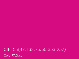 CIELCh 47.132,75.56,353.257 Color is a normal magenta color and the nearest color is Vivid Cerise #da1d81. Hex code #d60b81 and RGB value is rgb(214,11,129). In RGB color space, this color is composed of 84% red, 4% green, 51% blue, In CMYK color space, this color is composed of 0% cyan, 95% magenta, 40% yellow , 16% black , In HSL color space, this color has a hue angle of 325° , 90% saturation and 44% lightness.