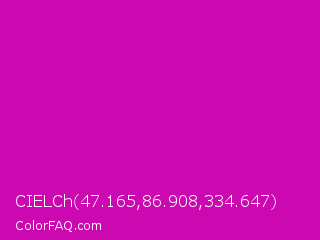 CIELCh 47.165,86.908,334.647 Color is a normal magenta color and the nearest color is Deep Magenta #cc00cc. Hex code #cc08b0 and RGB value is rgb(204,8,176). In RGB color space, this color is composed of 80% red, 3% green, 69% blue, In CMYK color space, this color is composed of 0% cyan, 96% magenta, 14% yellow , 20% black , In HSL color space, this color has a hue angle of 309° , 92% saturation and 42% lightness.