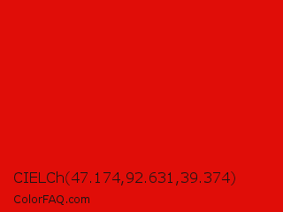 CIELCh 47.174,92.631,39.374 Color is a normal red color and the nearest color is KU Crimson #e8000d. Hex code #e00d08 and RGB value is rgb(224,13,8). In RGB color space, this color is composed of 88% red, 5% green, 3% blue, In CMYK color space, this color is composed of 0% cyan, 94% magenta, 96% yellow , 12% black , In HSL color space, this color has a hue angle of 1° , 93% saturation and 45% lightness.