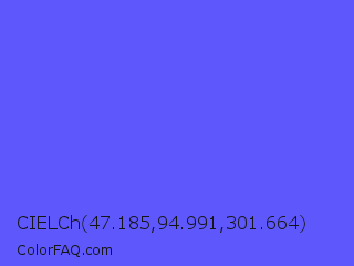 CIELCh 47.185,94.991,301.664 Color is a light indigo color and the nearest color is Very Light Blue #6666ff. Hex code #5e57fb and RGB value is rgb(94,87,251). In RGB color space, this color is composed of 37% red, 34% green, 98% blue, In CMYK color space, this color is composed of 63% cyan, 65% magenta, 0% yellow , 2% black , In HSL color space, this color has a hue angle of 243° , 95% saturation and 66% lightness.