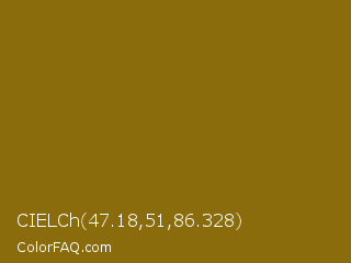 CIELCh 47.18,51,86.328 Color is a dark yellow color and the nearest color is Corn Harvest #8b6b0b. Hex code #8a6c0d and RGB value is rgb(138,108,13). In RGB color space, this color is composed of 54% red, 42% green, 5% blue, In CMYK color space, this color is composed of 0% cyan, 22% magenta, 91% yellow , 46% black , In HSL color space, this color has a hue angle of 46° , 83% saturation and 30% lightness.