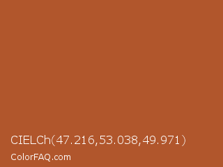 CIELCh 47.216,53.038,49.971 Color is a normal orange color and the nearest color is Paarl #a65529. Hex code #b1562c and RGB value is rgb(177,86,44). In RGB color space, this color is composed of 69% red, 34% green, 17% blue, In CMYK color space, this color is composed of 0% cyan, 51% magenta, 75% yellow , 31% black , In HSL color space, this color has a hue angle of 19° , 60% saturation and 43% lightness.