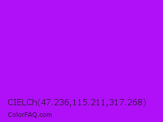 CIELCh 47.236,115.211,317.268 Color is a normal purple color and the nearest color is Vivid Mulberry #b80ce3. Hex code #af10f7 and RGB value is rgb(175,16,247). In RGB color space, this color is composed of 69% red, 6% green, 97% blue, In CMYK color space, this color is composed of 29% cyan, 94% magenta, 0% yellow , 3% black , In HSL color space, this color has a hue angle of 281° , 94% saturation and 52% lightness.